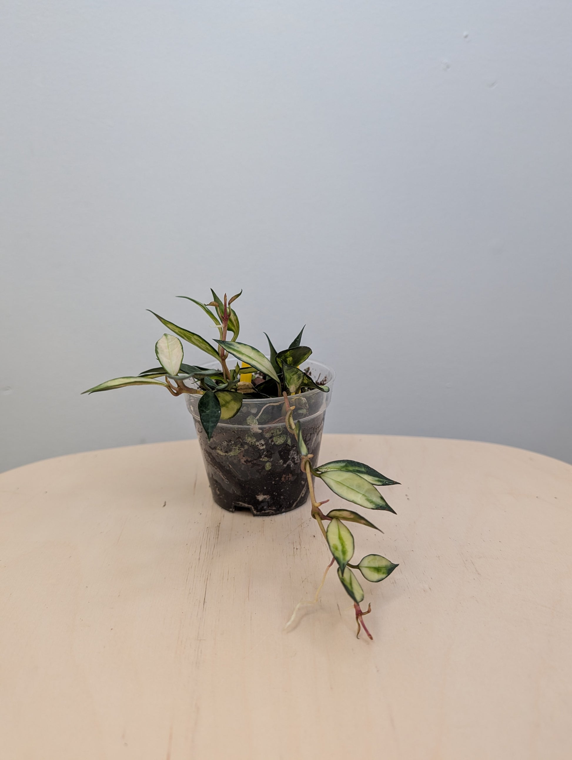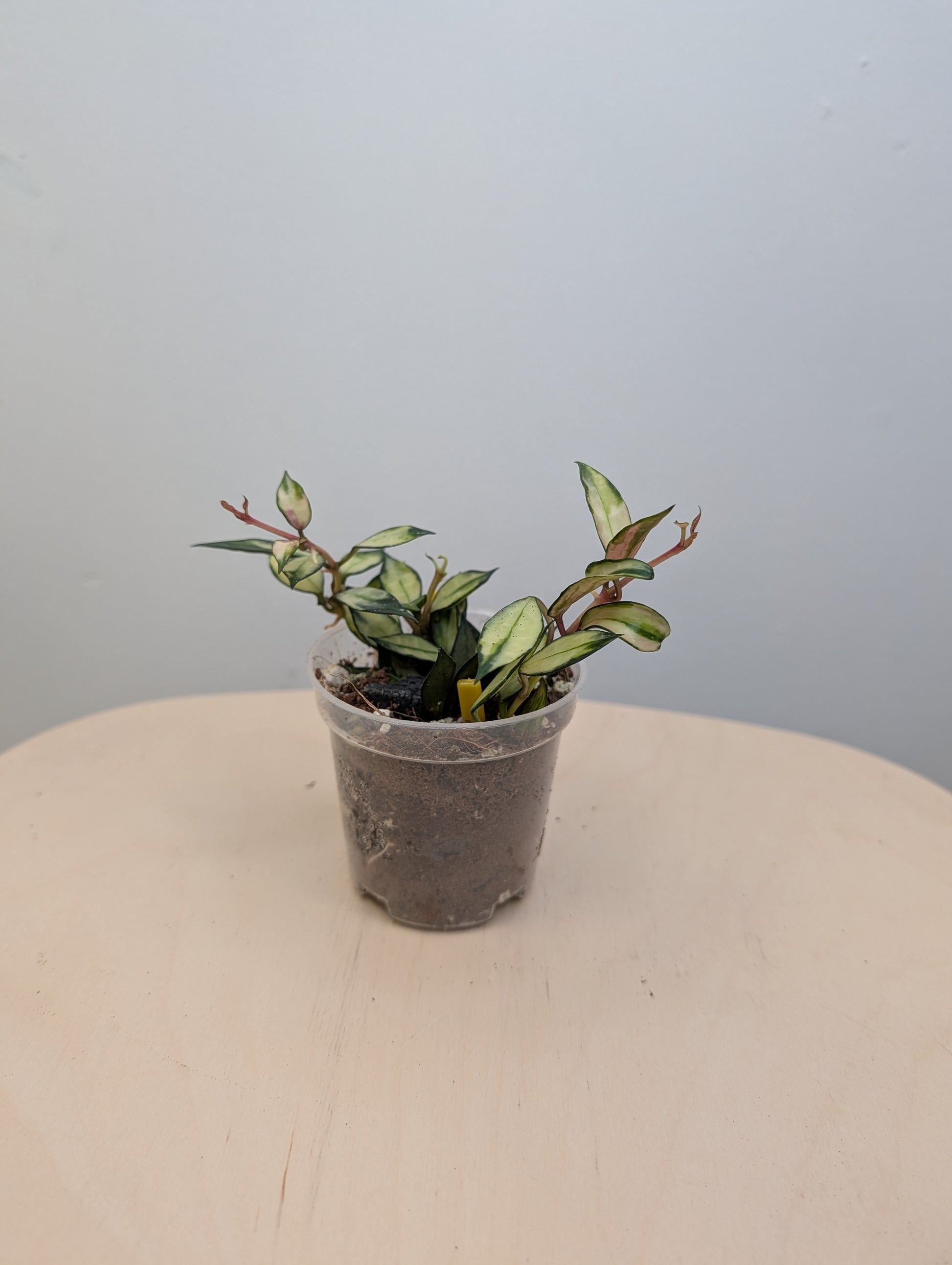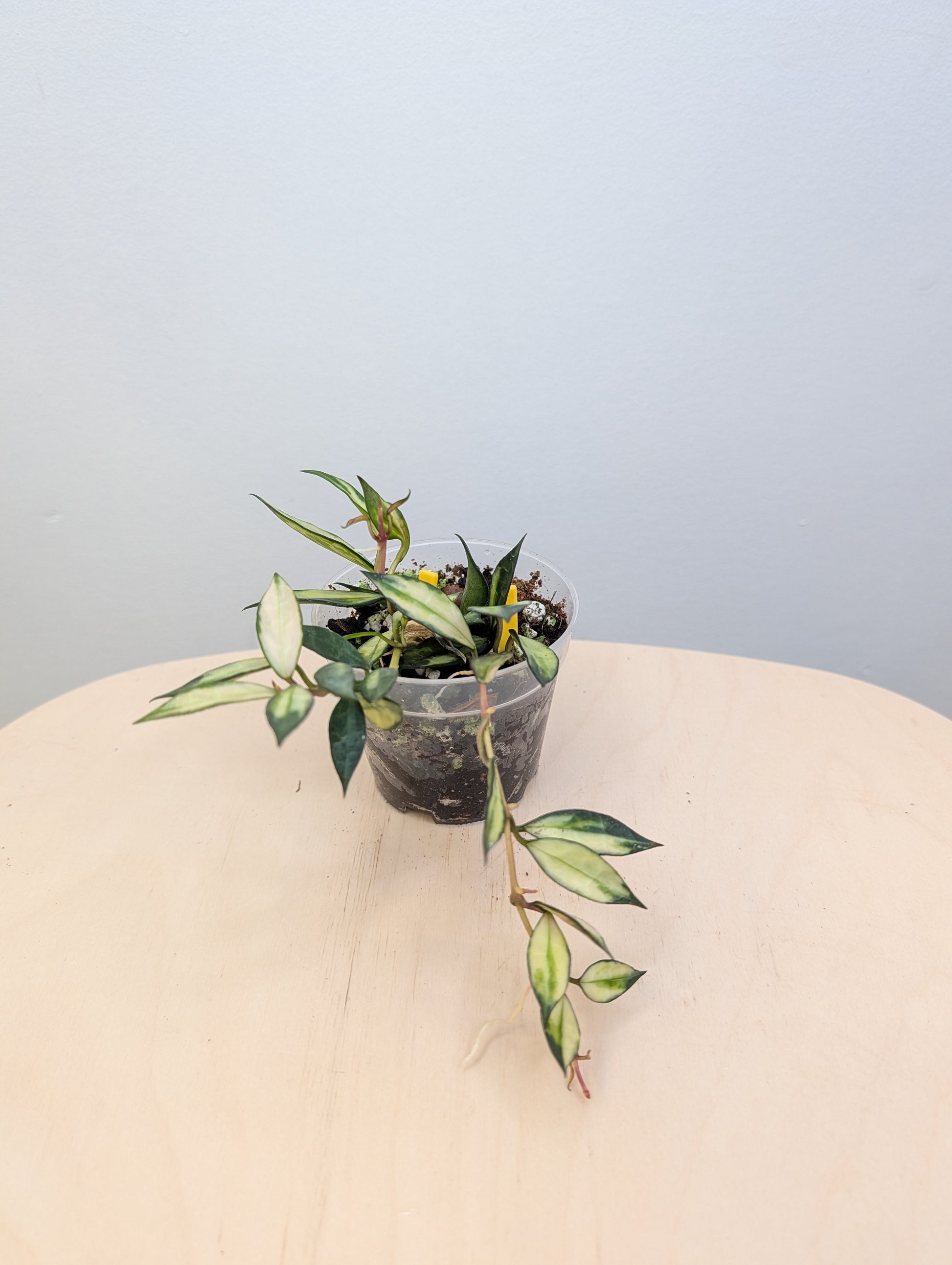 Hoya lacunosa variegated is a rare trailing hoya with small, almond-shaped leaves that feature creamy white or yellow variegation along the edges or center. Known for its compact growth and fragrant blooms, this variety is perfect for hanging pots, shelves, or small spaces. Under bright light, the leaves may develop pink or reddish tones.